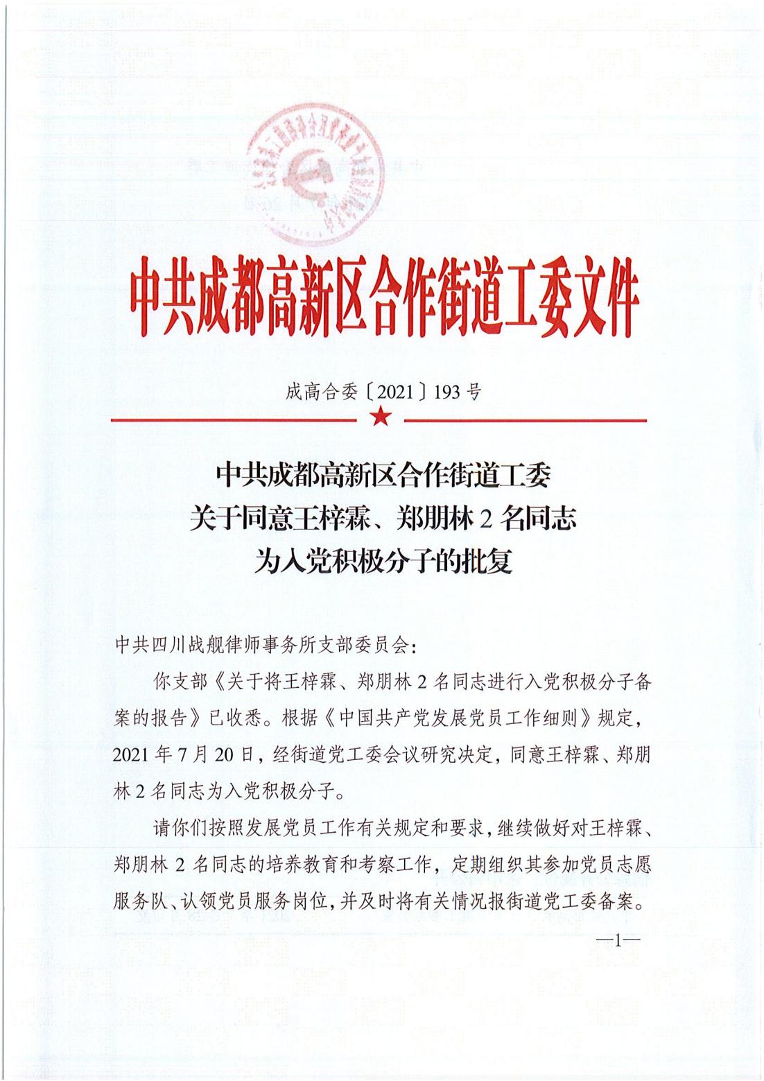 2021年7月20日,经街道党工委会议研究决定,同意王梓霖、郑朋林2名同志为入党积极分子